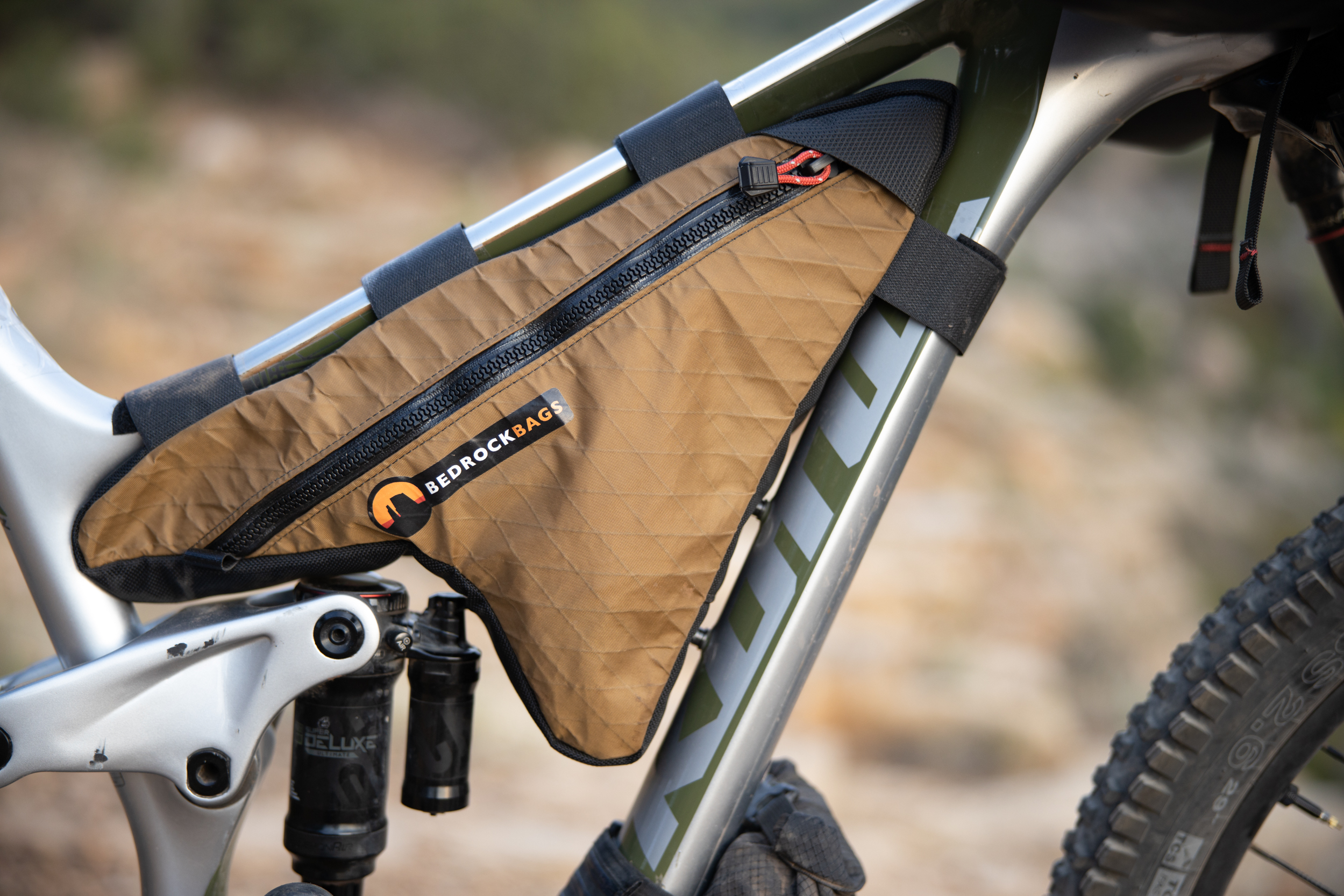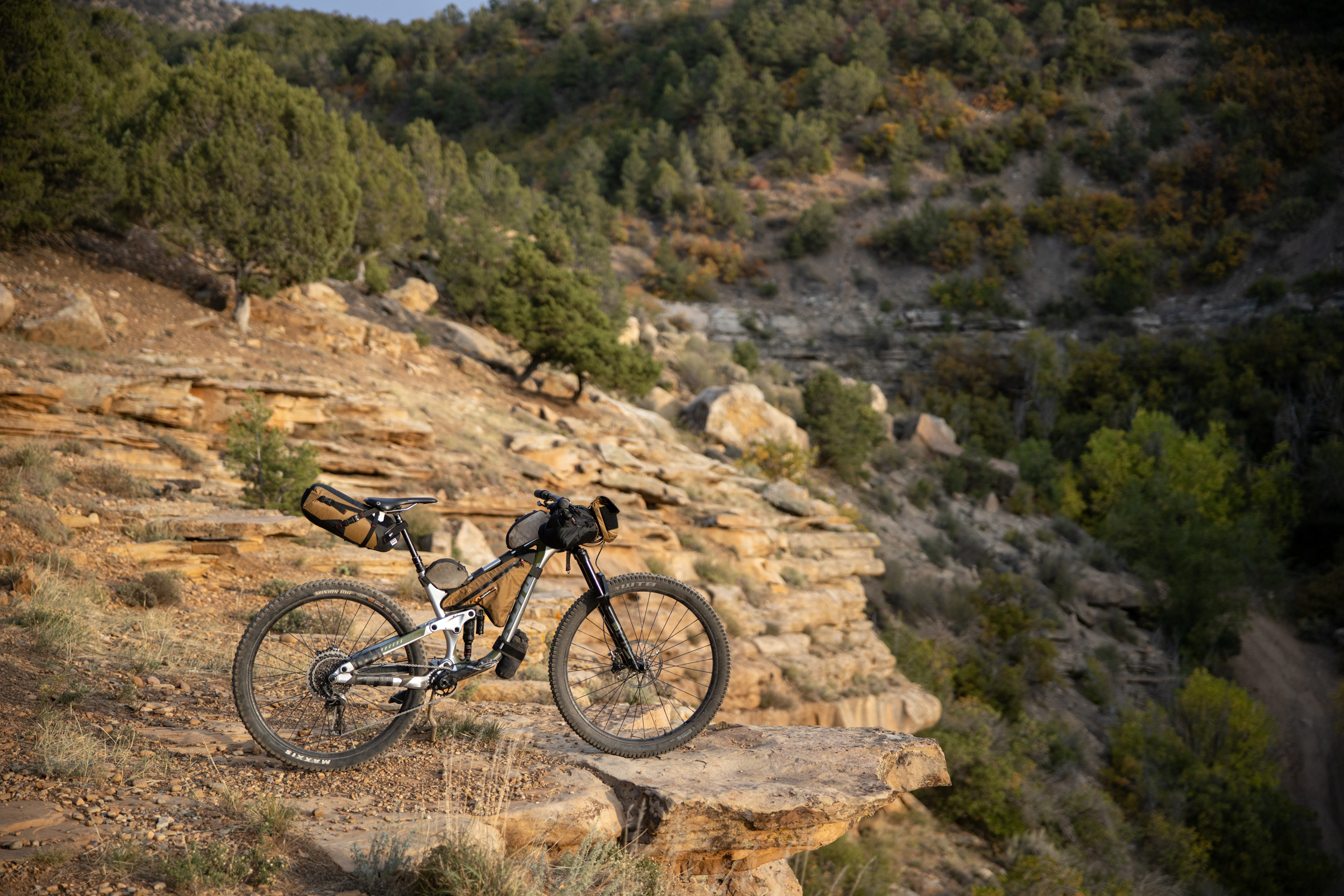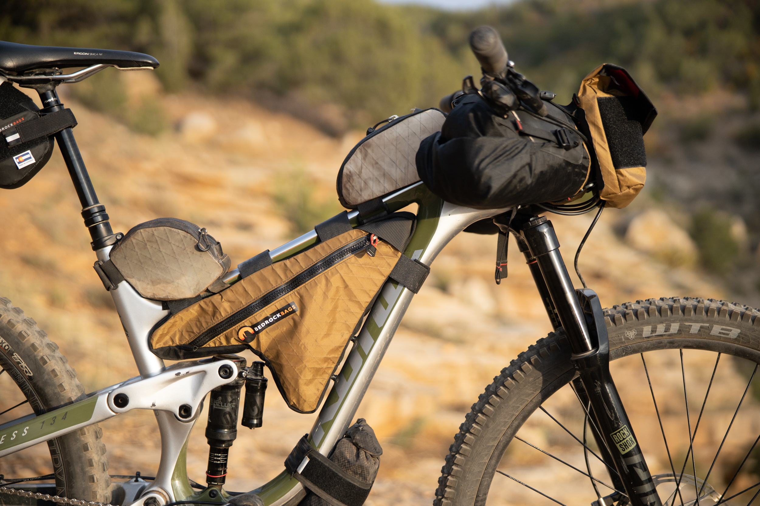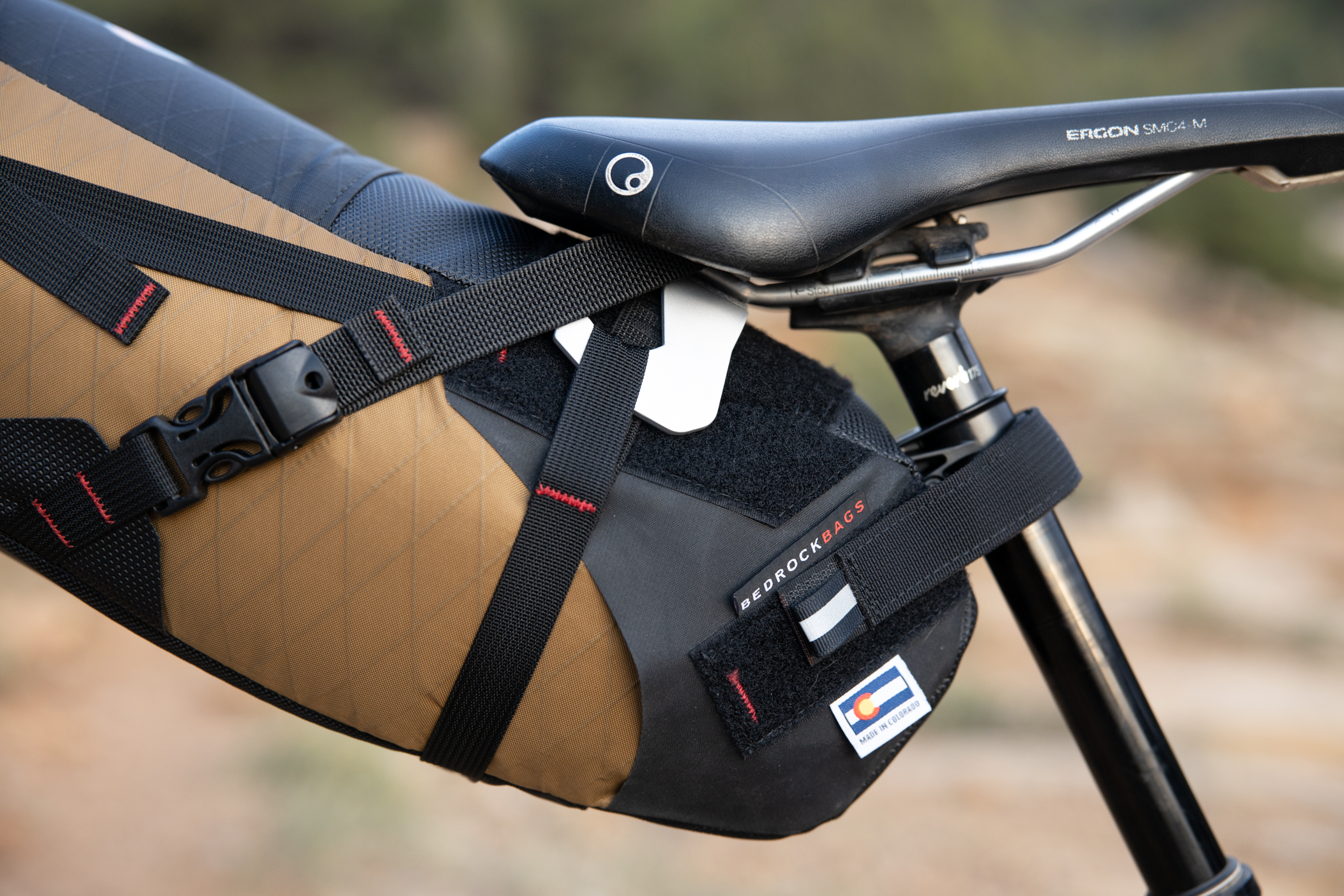 The Process offers plenty of frame space for a custom bag and no one does custom bags better than Bedrock Bags located here in Durango. Additionally, Bedrock Bags has revolutionized bikepacking bags intended to be used in technical singletrack terrain. Their Moab handlebar bag wraps around the headtube to keep weight centered. Their Black Dragon seat bag is designed around dropper posts. The slim configuration and integration with the Wolf Tooth Valias clamp enables you to drop your seat (most of the way) when the descents get techy. All of their bags are the most rock-solid bags I’ve ever used. No seat bag sway, the handlebar bag stays put, which helps increase the handling tremendously. Gosh, how about that Coyote brown colorway and desert tower stitching!
