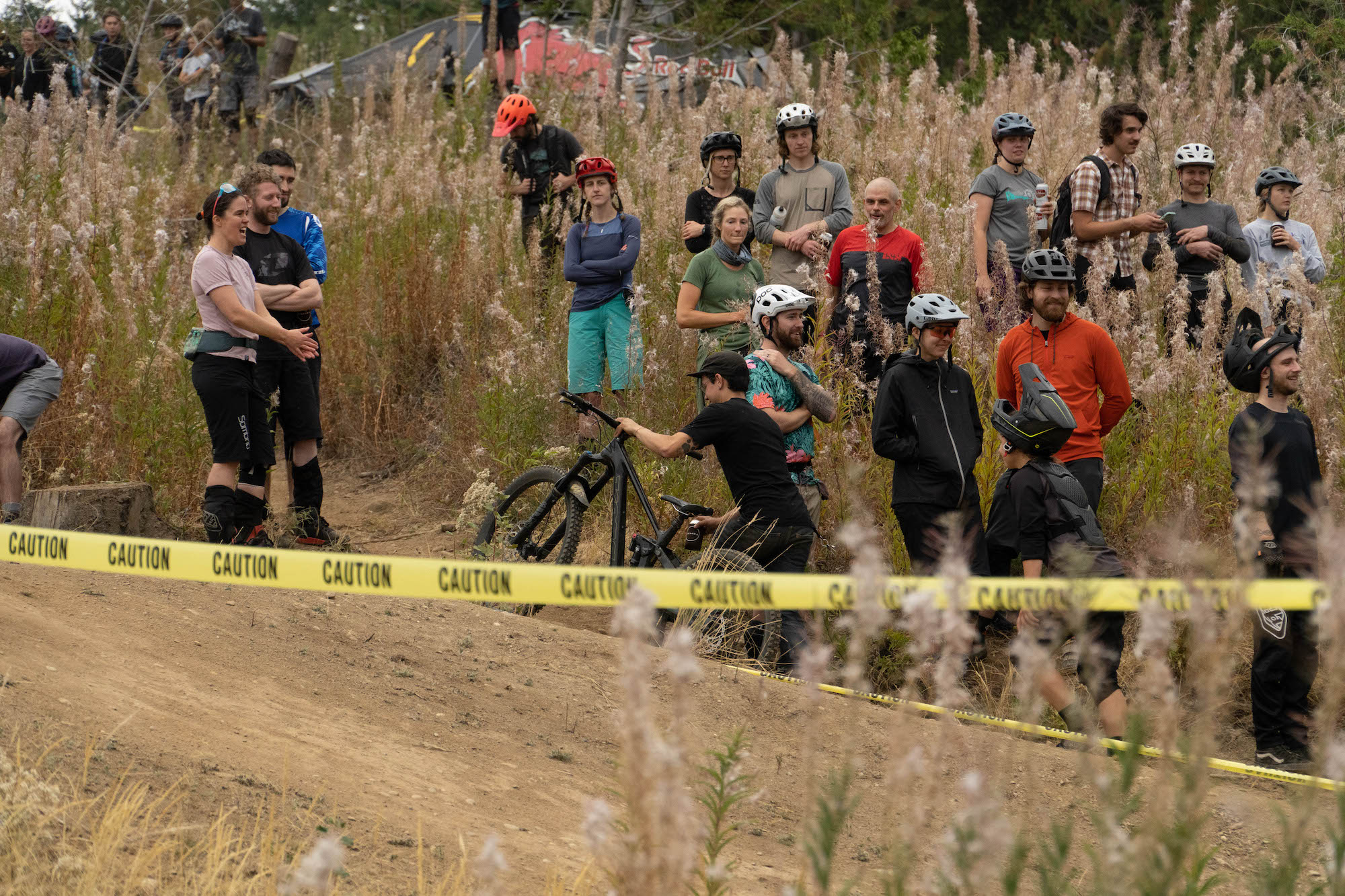 Spectators showed their support by pushing bikes up the hiking trail for the athletes.Â