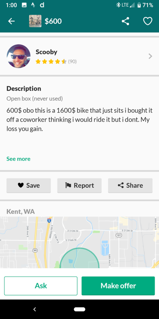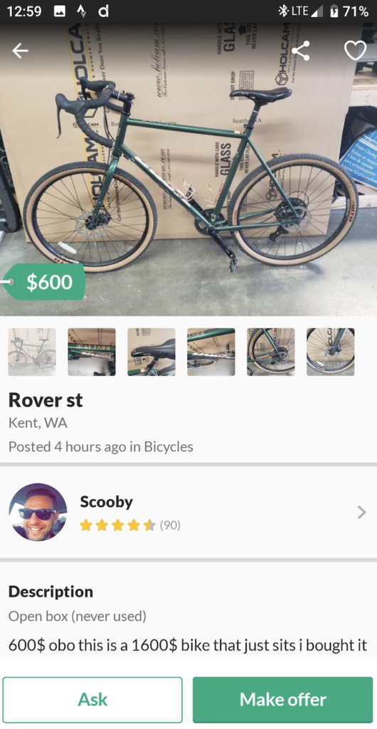Devastated but determined, Eric listed the bike stolen with Bike Index, a nonprofit online bike registry where anyone can register their bicycles for free. He also listed it as stolen on the Facebook group, PNW Lost/Stolen Bikes (https://www.facebook.com/groups/pnwLostStolenBikes/). The following Wednesday, a member of PNW Lost/Stolen Bikes messaged Eric and shared an ad he spotted on OfferUp: