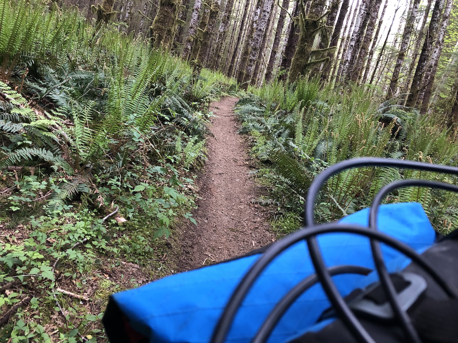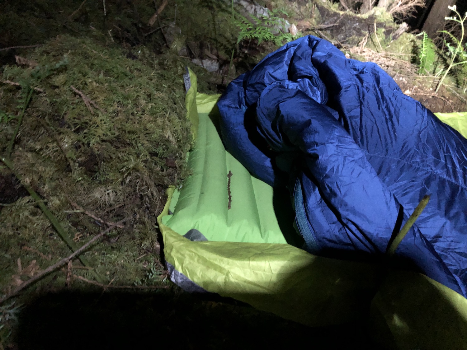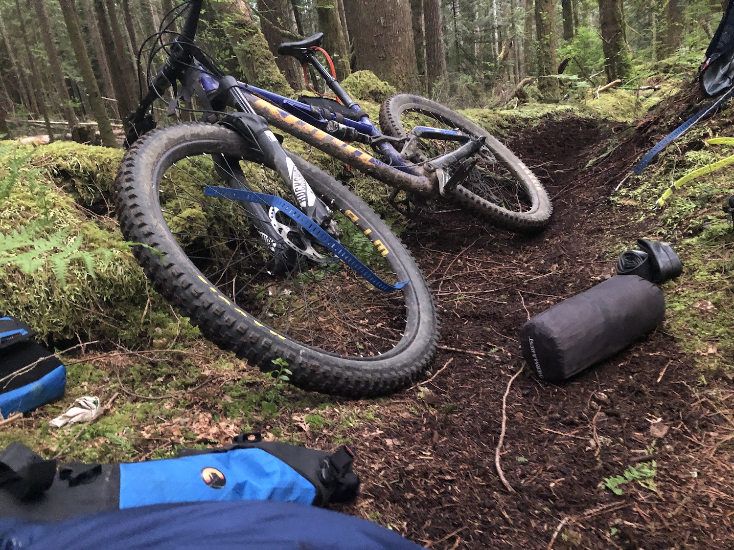 After 3 hours of night riding, at midnight I was roughly at the 3/4 point and decided to pitch my sleep system on a ribbon of loamy singletrack. I harvested a few handfuls of moss for my pillow, blew up my matt, and tucked myself into my sleeping bag. There was no other way I would want to end my day of riding, safely posted up, with no mechanicals surrounded by the rainforest, sleeping on a ribbon of loam.