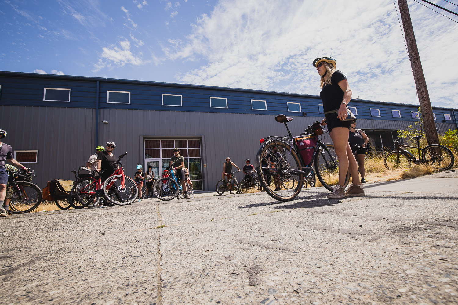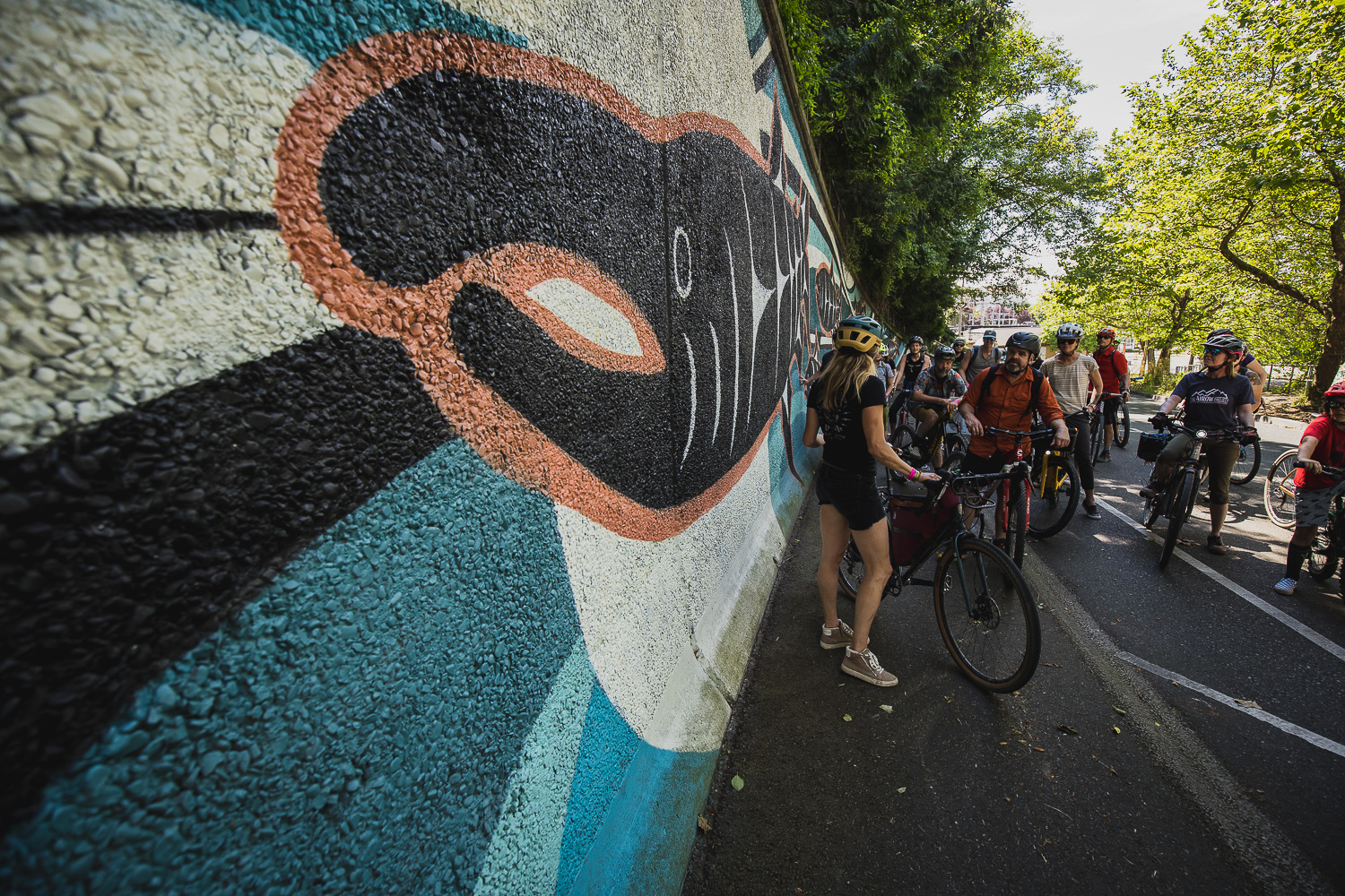 Many riders gathered to learn from Gretchen who had many stories to tell not just about her own art, but the entire street art scene in Bellingham. She chatted about it’s roots, and key players who paved the way for the art we can appreciate today. She also educated the riders about the hierarchy of “tagging,” explained the myriad of tagging terms, and help decipher what is art vs what is essentially just vandalism.