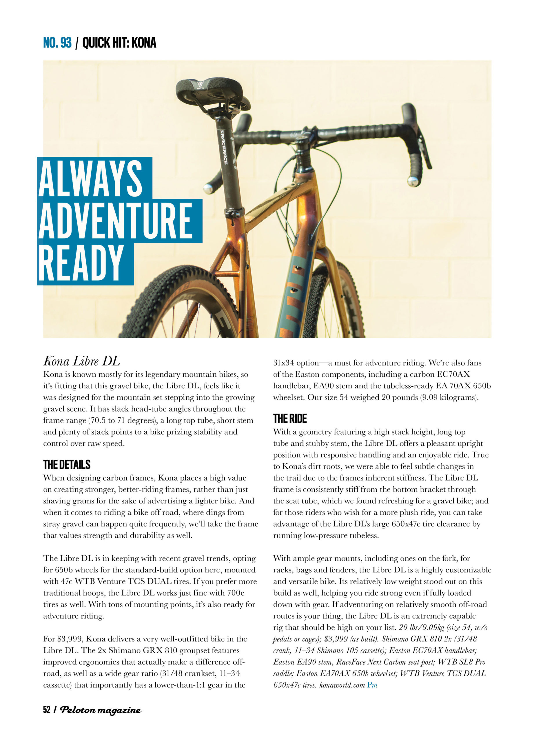“With ample gear mounts, including ones on the fork, for racks, bags, and fenders, the Libre DL is a highly customizable and versatile bike. Its relatively low weight stood out on this build as well, helping you ride strong even if fully loaded down with gear. If adventuring on relatively smooth off-road surfaces is your thing, the Libre DL is an extremely capable rig that should be high on your list”