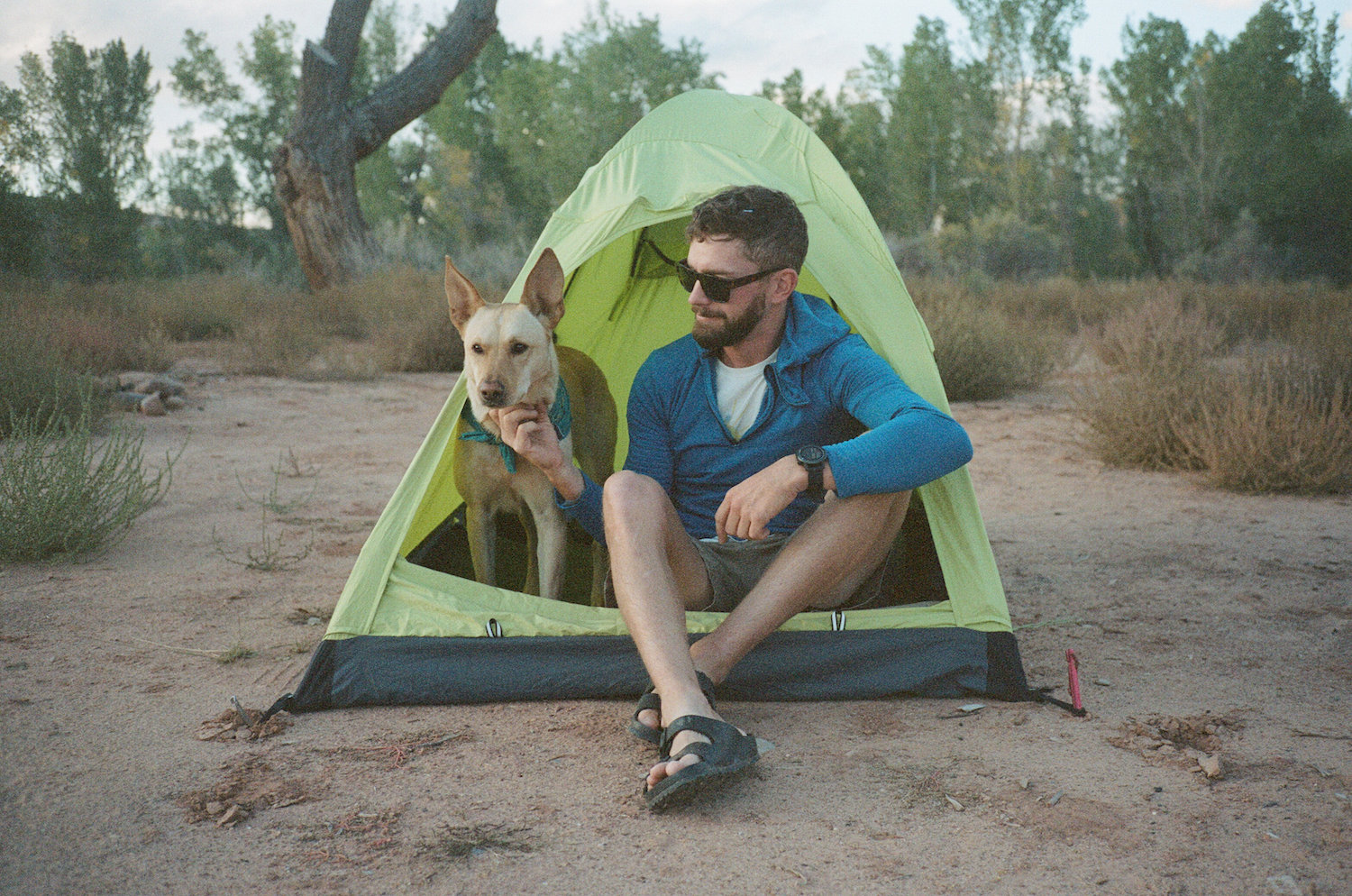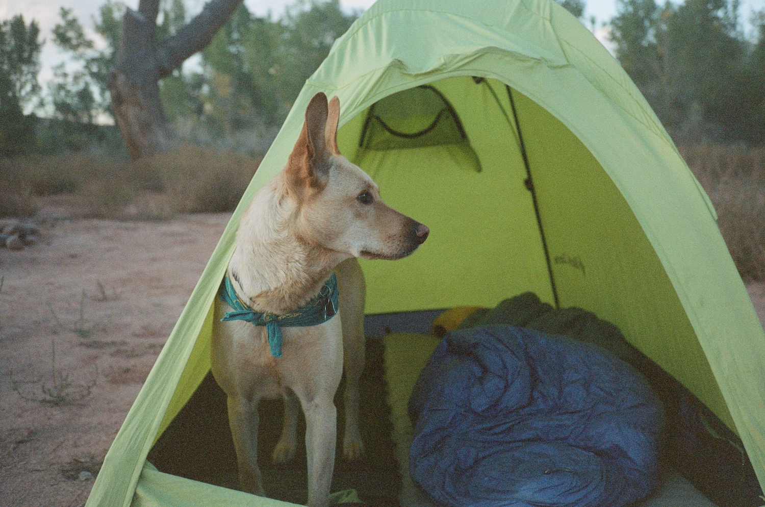 - Sleep system: Juniper sleeps at our feet inside our tent. We have a little packable blanket that she enjoys sleeping on/in. If it’s cold enough, we’ll bring her jacket as well!