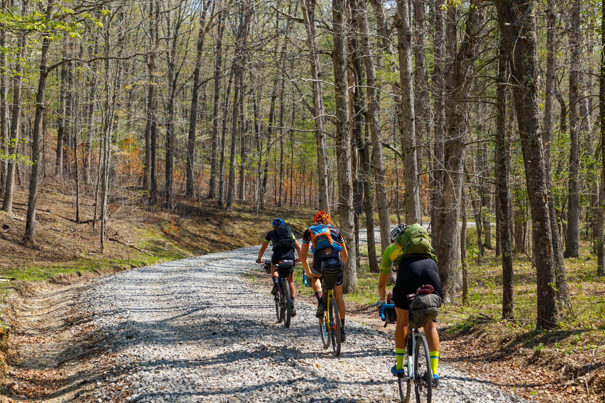 After cruising out of town on bike path we hit Carvin’s Cove. There is a service access rd that climbs up and over a ridge and drops down to the other side of the reservoir. This was the first off road test for our bags and setups. Luckily, we passed the test as everyone and their bikes ripped down the chunky Brushy Mtn Rd in one piece.