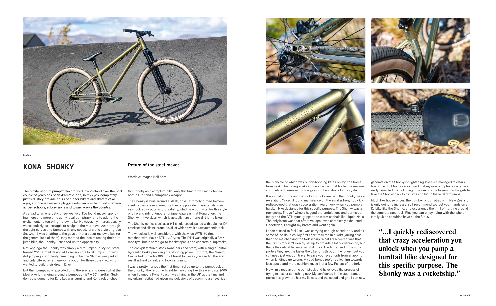 The crew at Spoke Magazine in New Zealand recently reviewed the 2021 complete Shonky. While testing the bike they discovered that hitting up the local pump track had unintended side effects. “I’ve also found that my new pump track skills have really benefited my trail riding. The next step is to summon the guts to take the Shonky back to its roots and hit up the local dirt jumps.”