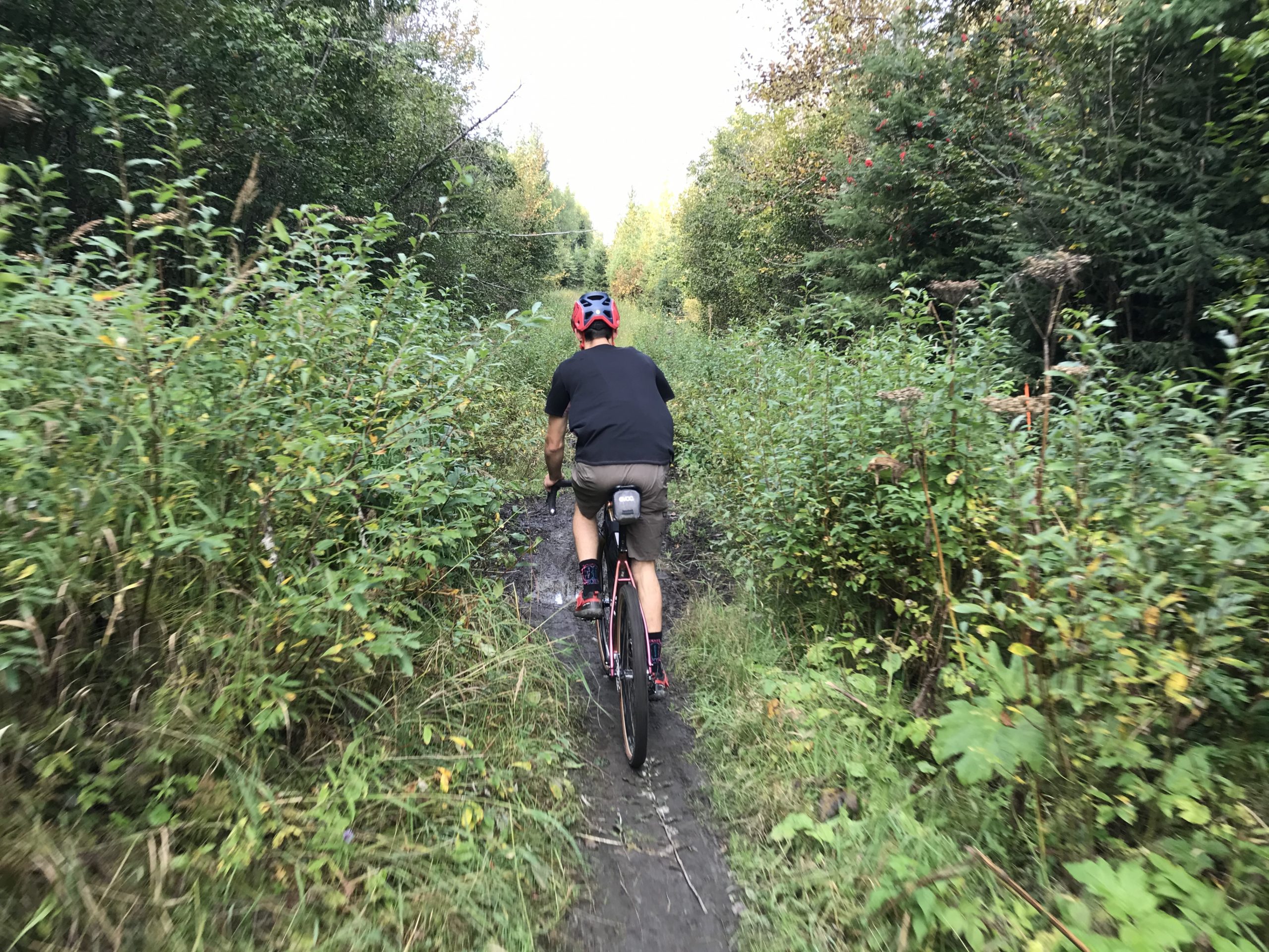 A few kilometers in the trail quickly turn from a dirt road to wet double track. Earlier we talked to someone on a ATV and we knew to take the steep left up the ridge to the highpoint this eventually would take us to a old forestry road. Which was supposedly a “short” ride out to the highway.