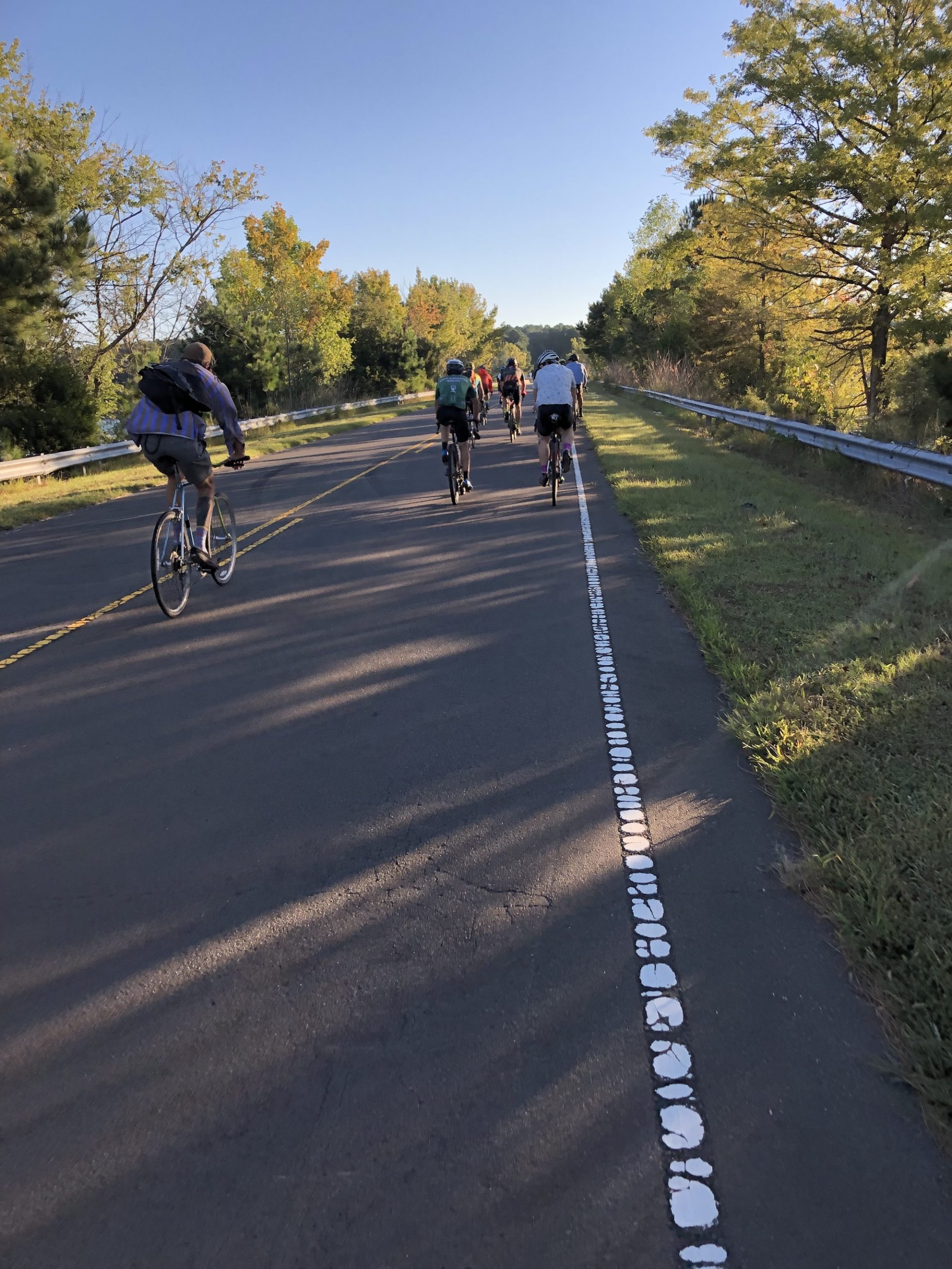 The rolling hills around Falls Lake lead us to our first car-free section, the Neuse River Greenway, which is a 44 kilometer paved greenway with scenic views of the Neuse River. Our route takes us through about 32 kilometers of it and while it’s a joy to not have to worry about cars, you do have to navigate other cyclists, runners, walkers, baby strollers, roller bladers, and the occasional snake as you make your way South towards downtown Raleigh. Raleigh is the capital city of North Carolina and once you exit the Neuse River Greenway there are a series of smaller greenways and short road connections that get you to the gravel roads of Umstead State Park and the extensive greenways of the town of Cary. You hit downtown Raleigh right on the halfway mark, so it’s a good time to seek out some supplemental snacks with easy access to convenience stores. We have traditionally made a stop at a local brewery, but the earlier start this year put us in downtown before noon, so we had to settle for salty/sugary snacks instead.