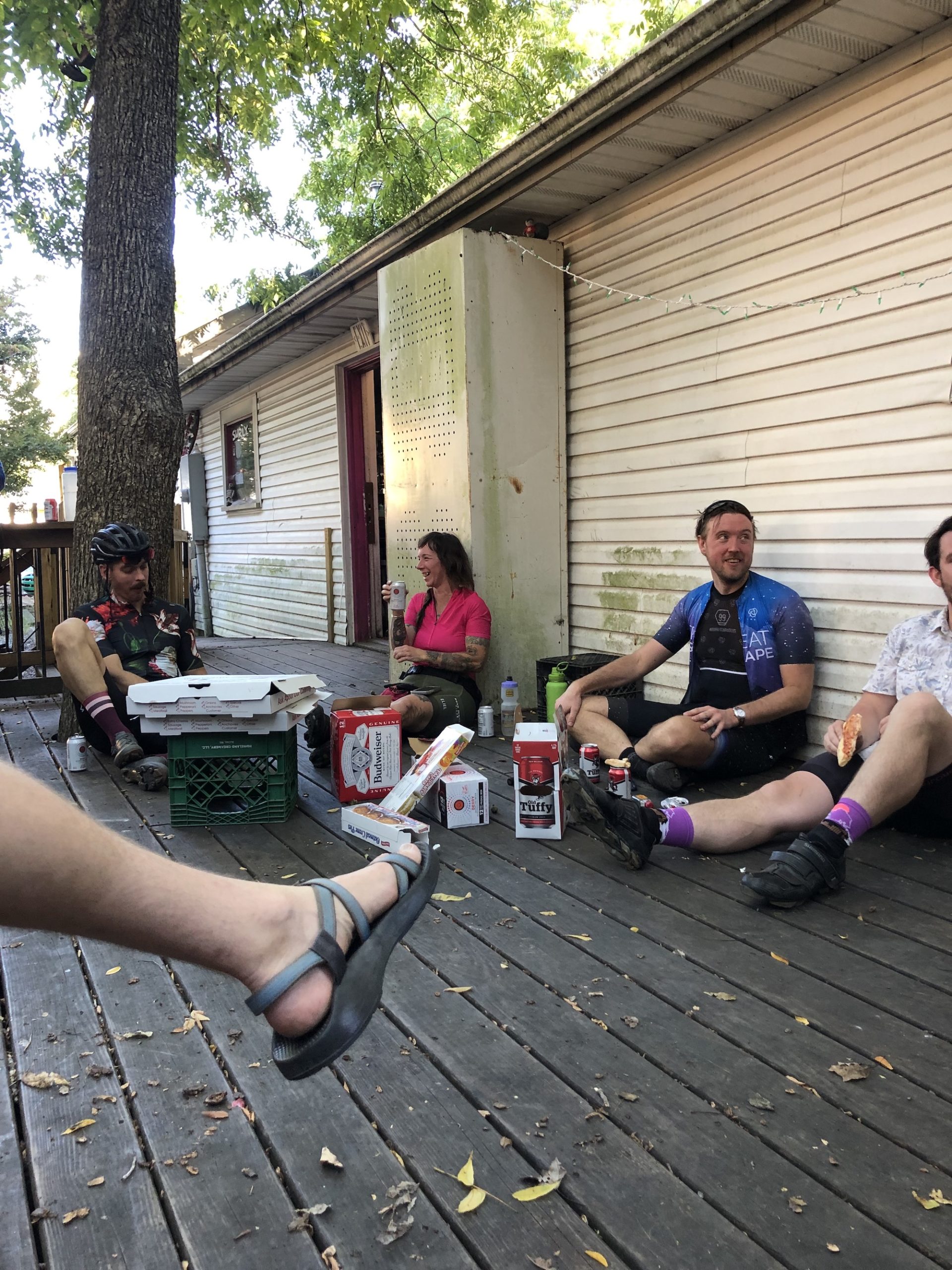 Once we exit the ATT it’s a bit more road to greenway connection over to Chapel Hill, the 3rd city of the Triangle. At this point you are really feeling any hills and the grunt up into the aptly named Chapel Hill is mentally and physically challenging. The upside is that some of us know there is a special stop coming up that will lift our spirits for final stretch back to Durham. The route through Chapel Hill takes us within a block of the shop I work at, Back Alley Bikes, and our good friend Jordan (out of the ride this year due to spill resulting in some broken ribs) has set up a final stop filled with all the things we are craving at around 175k in the ride. There are tasty cakes, oatmeal crème pies, pizzas, seltzer waters, and cold beers!