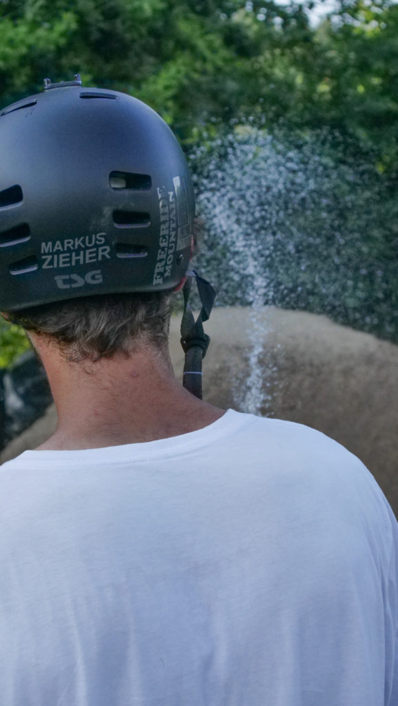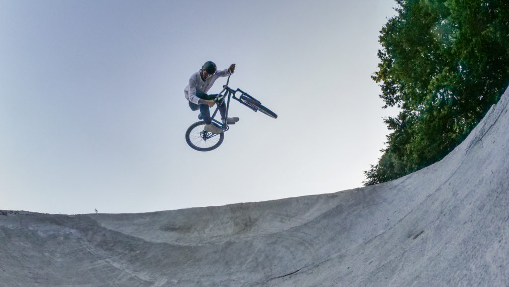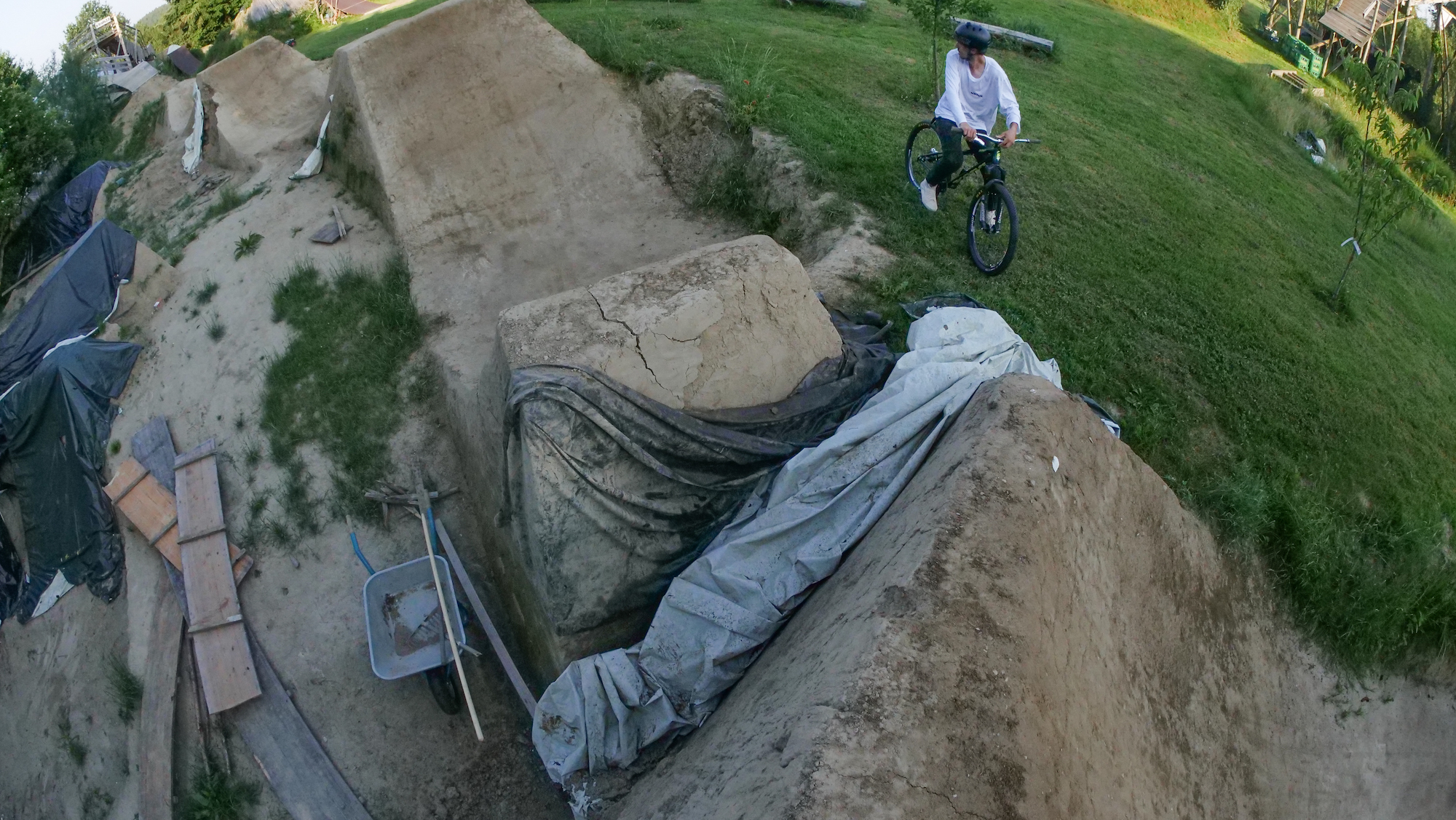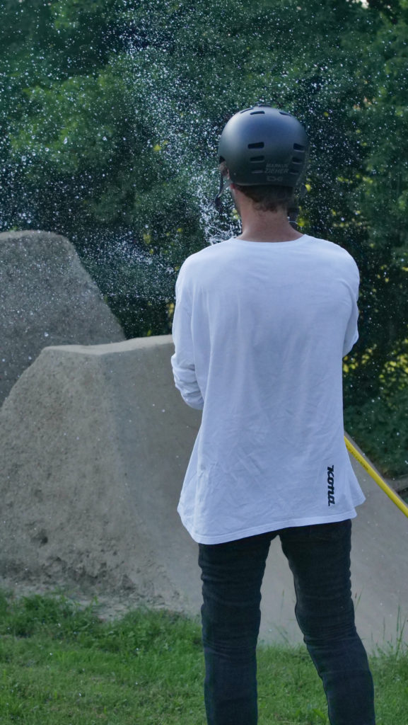 It’s a hot day and there are no clouds in the sky. Before the actual session, we watered the jumps to make them mint to ride.