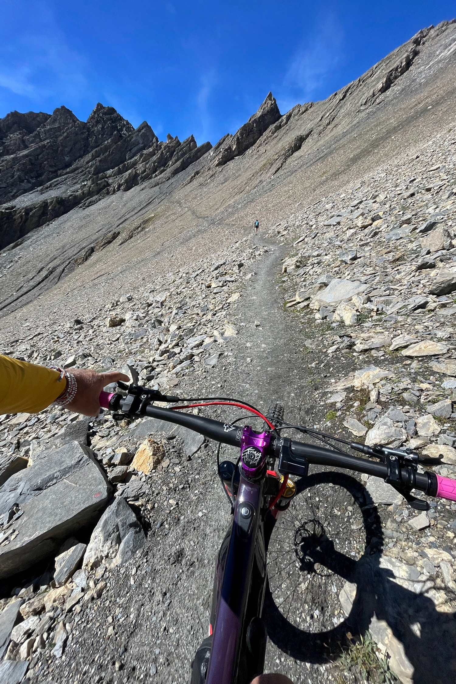 Starting the second day with a massive downhill, we looked at the day with excitement as this is the hardest one of the trip. The first pass is endless and requires a short but intense hike-a-bike. Charging the batteries in a hotel around 1pm, we had time for a good pizza, celebrating our entrance to Italy. That same evening we were in France for the second night after 2800 meters of climbing in the day. True happiness, sharing the moments as a guide was a great time, and the eBikes help for that.