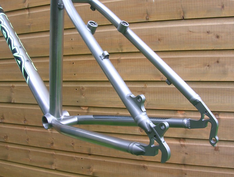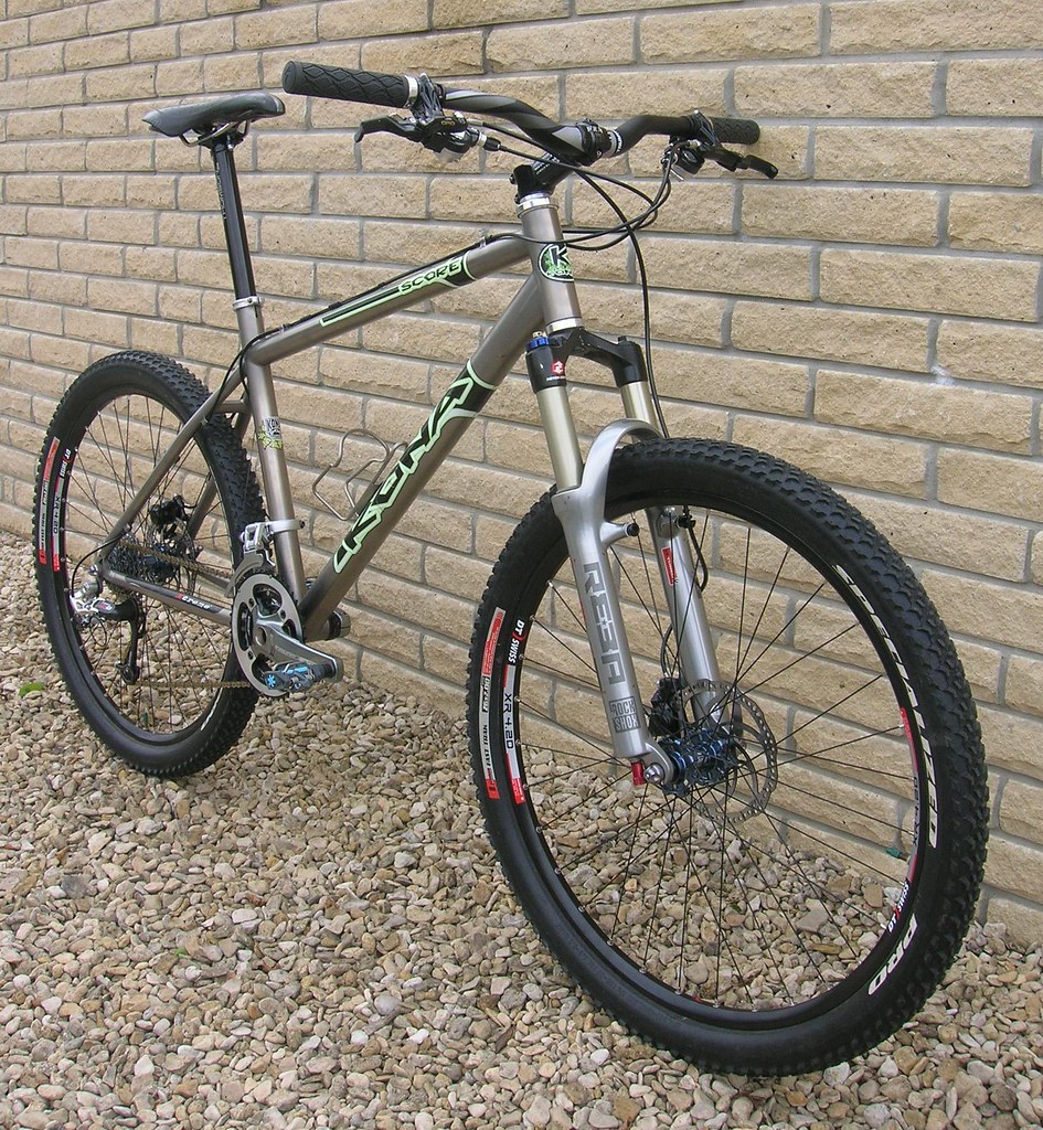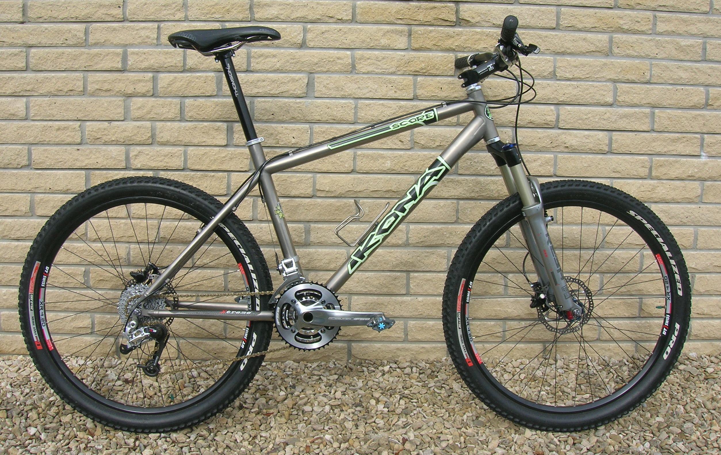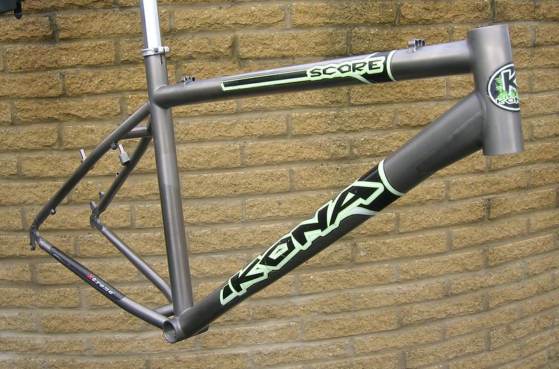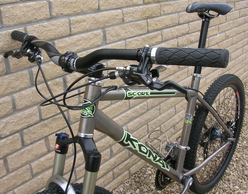 By 2000, Kona has been producing titanium frames for 10 years, in partnership with Sandvik, with much success across the fledging downhill scene in the early 90s then later in the XC discipline. Riders loved the blend of strength, durability, and responsive trail feedback. Therefore, the Score was born, and incorporated specific design details that only appeared on this model including a multi-shaped reinforced gusseted downtube, 6/4 plate dropouts (for strength and better wheel alignment), and a CNC milled headtube. The frame weighs between 1670gm (3.6lbs) and 1905gm (4.2lbs) depending on the size.