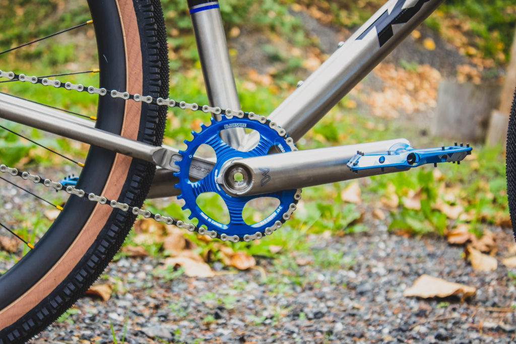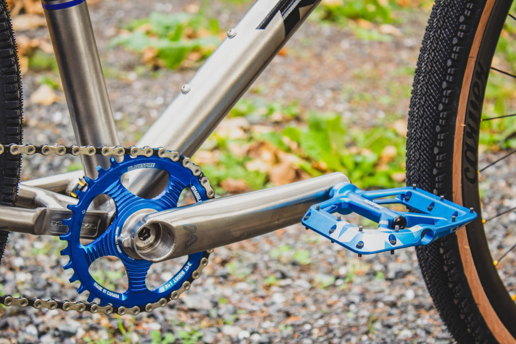 Yes, those cranks are exactly what you think they are. Cane Creek’s insanely strong yet exquisite titanium eeWings. The 400gram crankset is 20-30% stiffer than premium carbon cranks and uses a propriety 30-tooth hearth joint joining the crank together, it also features hollow tube arms for a superior stiffness-to-weight ratio and a CNC machined aluminum preload with a titanium bolt for a more precise and durable setup. Not that he’ll need it but the eeWings come with a 10 year warranty!