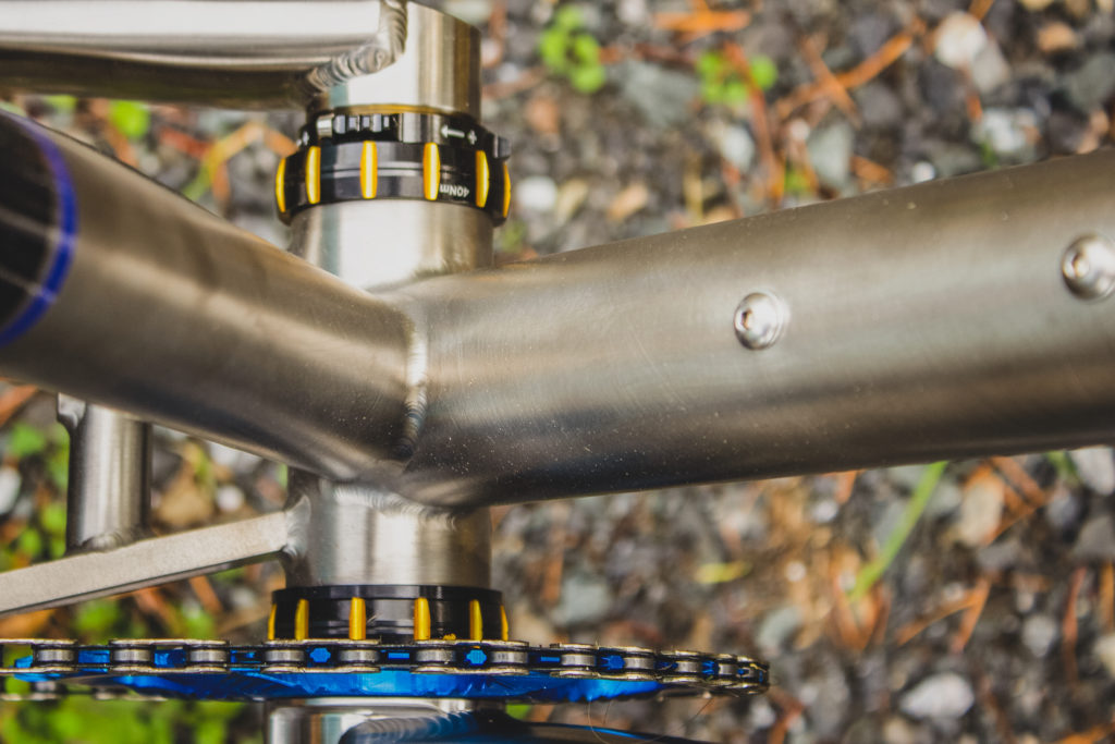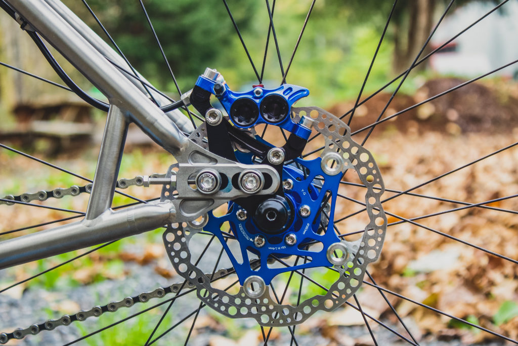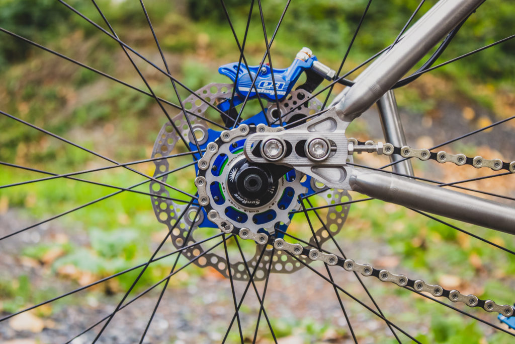 Bringing Sexy (out) Back. The Humuhumu’s sliding rear dropouts make for super easy single speed set up. Out back on Dan’s build, you’ll find the chain wrapped around an 18t Chris King stainless steel single speed cog, the cog is mounted to Barnoldswick’s finest, a set of Hope Pro 4’s.