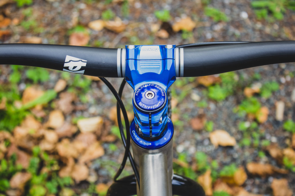 A 50mm AM/FR Hope stem holds the Race Face SixC bars in place, while a Chris King headset ensures that things will be running smoothly for years!