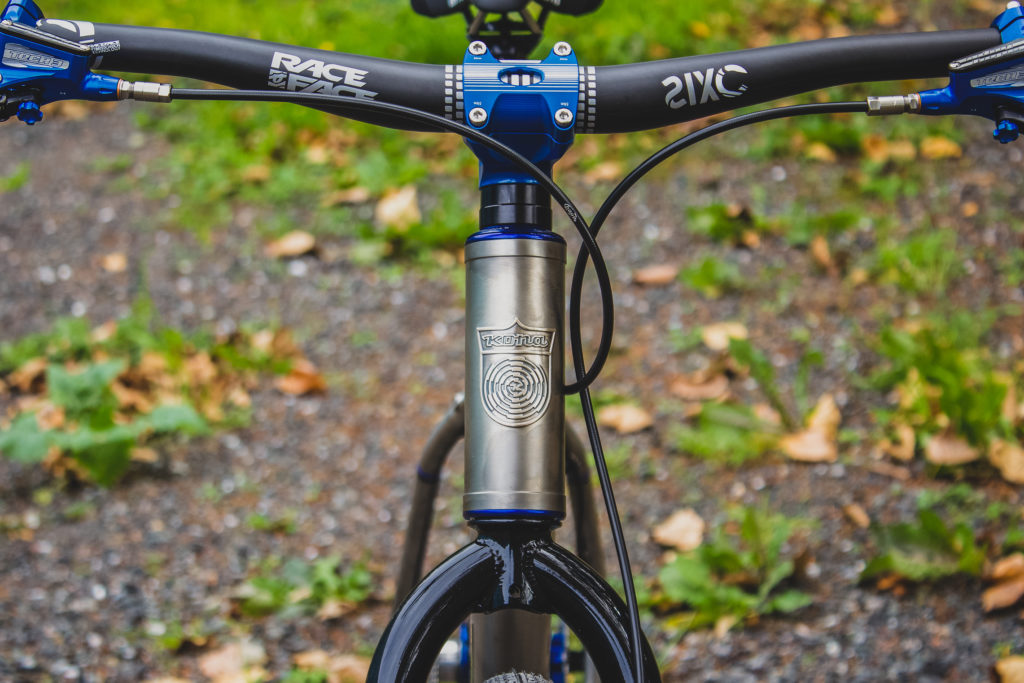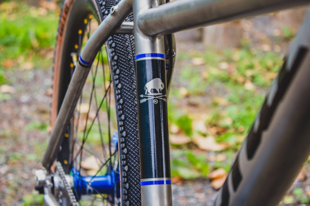 The Hope Pro 4’s are laced to 38mm Carver carbon hoops. The fork was made especially for the build and is a Cromo thru-axle fork with a 435mm axle to crown height, it uses the 2020 Unit dropout. Rubber is courtesy of WTB and is their hugely popular and versatile Venture 50 tire.