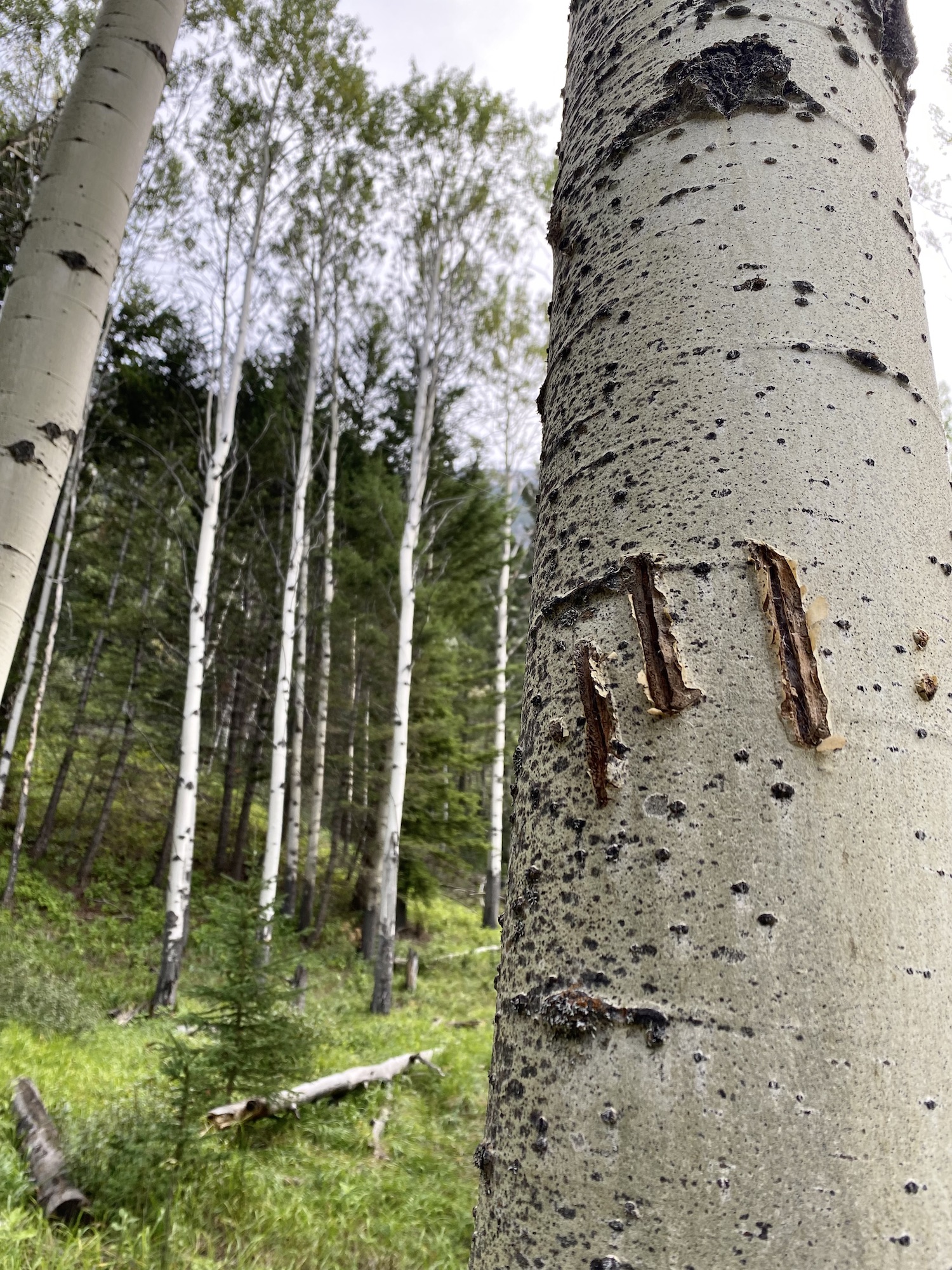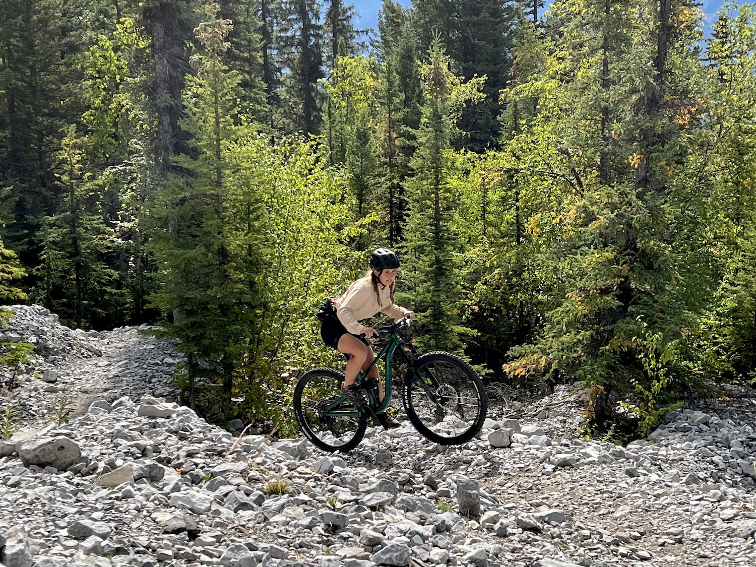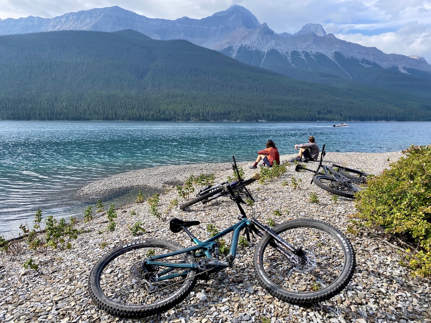 Another change was that the multi-use trails, closed seasonally to bikes, were open once again. I was lucky enough to spend a day riding around the shoreline of Lake Minnewanka – meaning ‘the lake of spirits’ in the Stoney-Nakoda language – on the day it officially reopened. At the far end of the ride, I noticed bear claw markings on the trembling aspens and accidentally laid my bike on top of a fresh pile of scat. Even though we were only 15km from the trailhead, it was clear we were in an area seldom visited by hikers. We finished our snacks on a gravel spit by the lake and then raced the cross-country single track back to the car park. We didn’t run into any bears, spirits, or spirit-bears, but it was exhilarating to be travelling through an area that felt so remote.