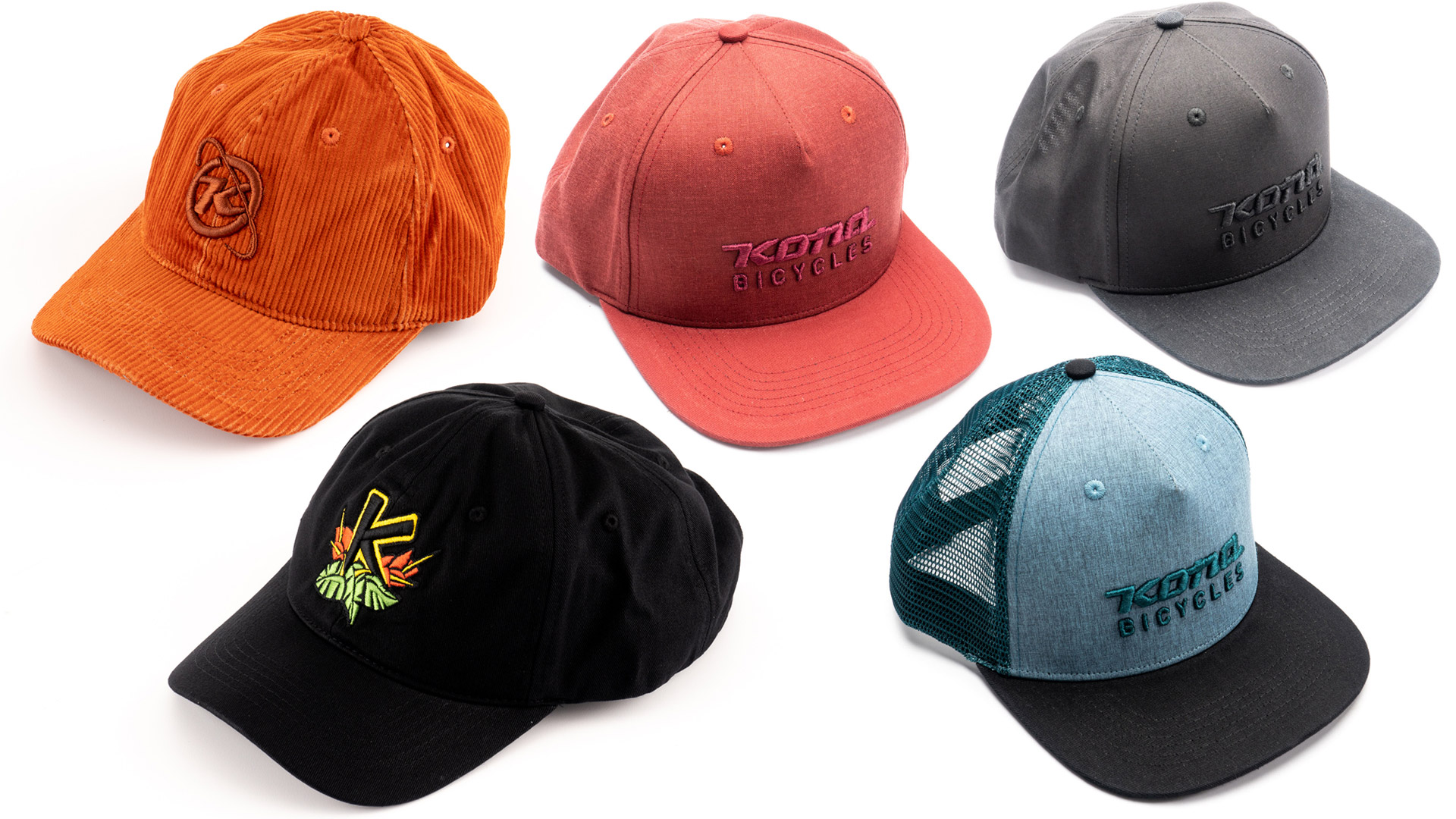 Summer is roasting this year. Is your forehead getting sunburned? Solution! We’ve just added five new Kona caps and they’re shipping right now. We’ve got stealth grey and red logo hats, the orbit logo on orange corduroy, a green and black trucker hat, as well as the vintage Kona flower logo on black.