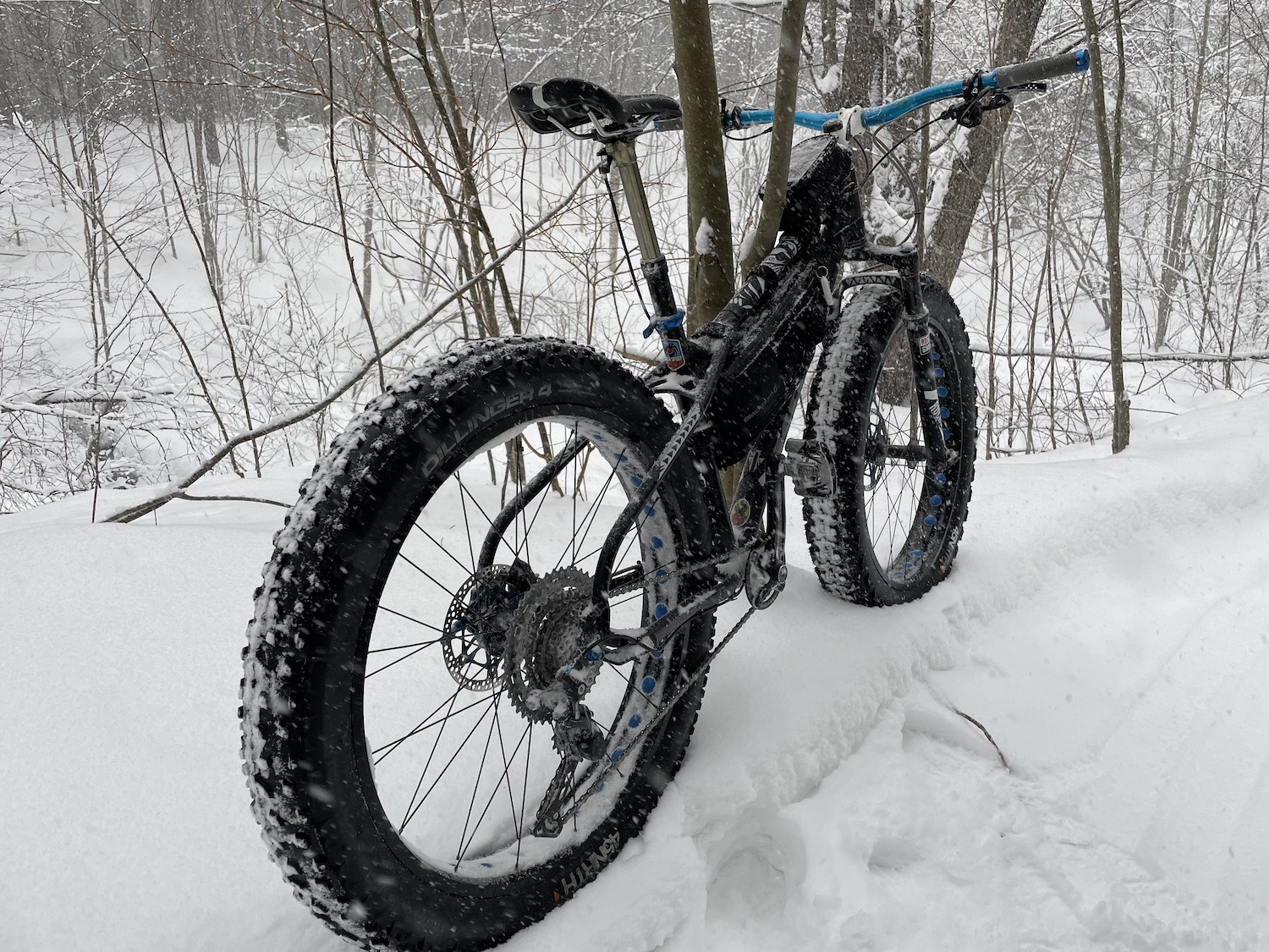 What Are You Riding This Winter? I ride a Kona Wo fatbike in the winter on singletrack mountain bike trails. My fatbike is set up more like a mountain bike since it has a front suspension fork and a dropper post.