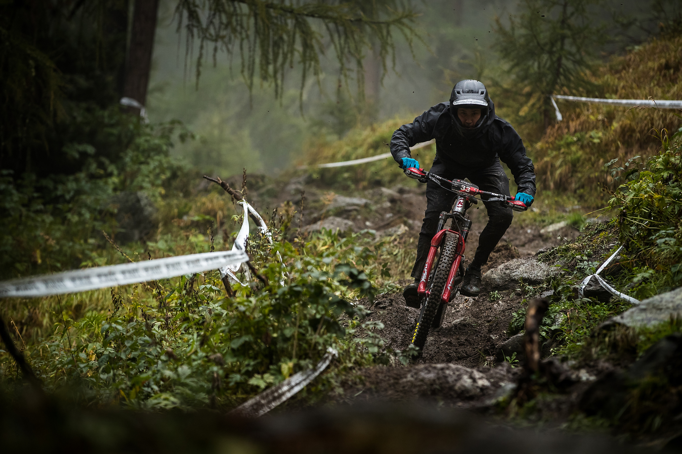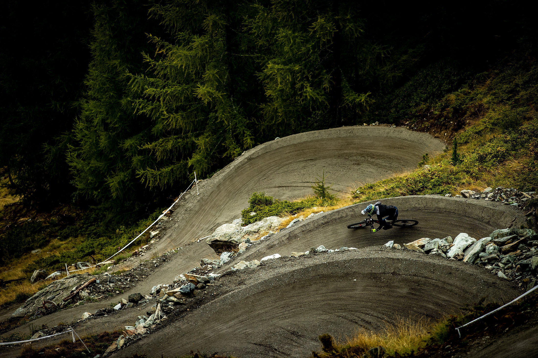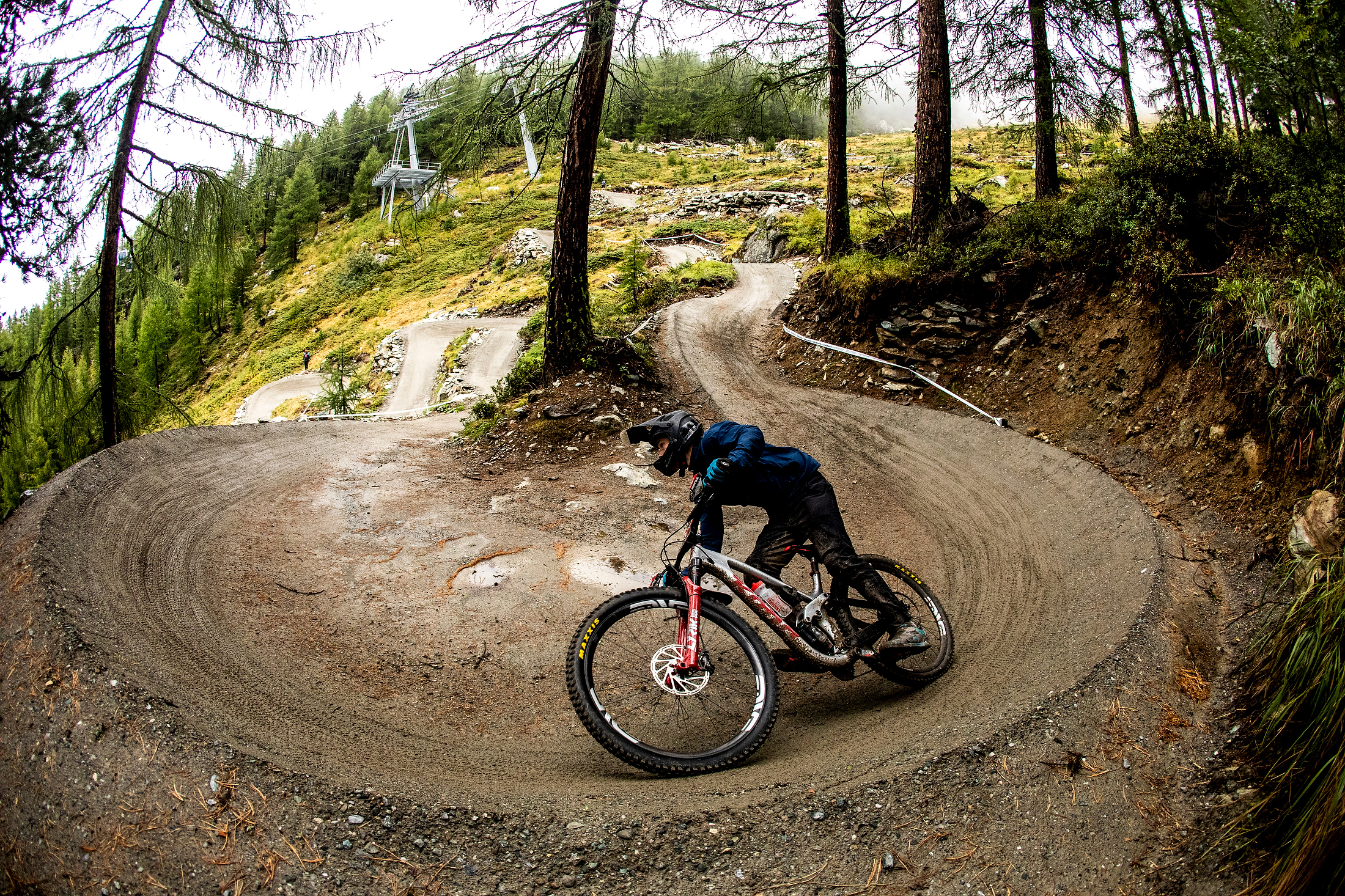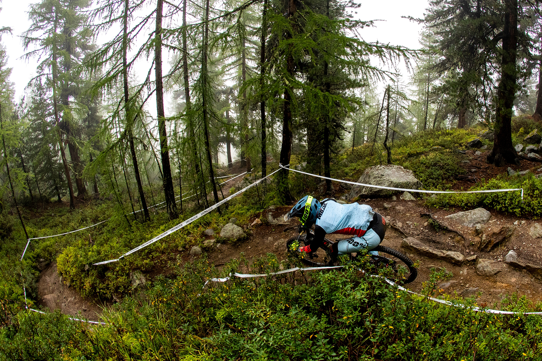 With Connor Fearon opting out of traveling overseas for any international racing this year, teammates Miranda Miller and Rhys Verner kept the Kona Flag flying. Having had a few days getting used to riding next to the Matterhorn in dry conditions things started to get a little damp. Miranda has made it no secret that she is not a fan of the Zermatt trails, mentioned that the wet weather actually made the tracks more fun (plus no big giant Toblerone to get distracted by!), and was excited for race day.
